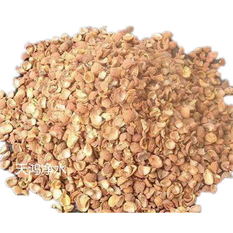 果殼濾料采用優質山核桃殼作原料,經破碎、拋光、蒸洗、藥物處理,多次篩選加工而成。此濾料耐磨、抗壓、不在酸堿性水中溶解,截污能力強、濾速快,并經特殊的物理化學處理(將其色素、脂肪、油脂、電付離子去除干凈),使果殼濾料在水處理中具有較強的除油性能,除固體微粒,易反洗等優良性能,廣泛運用在油田含油污水處理、工業廢水處理和民用水處理。果殼濾料是取代石英砂濾料,提高水質,大幅度降低水處理成本的新一代濾料。